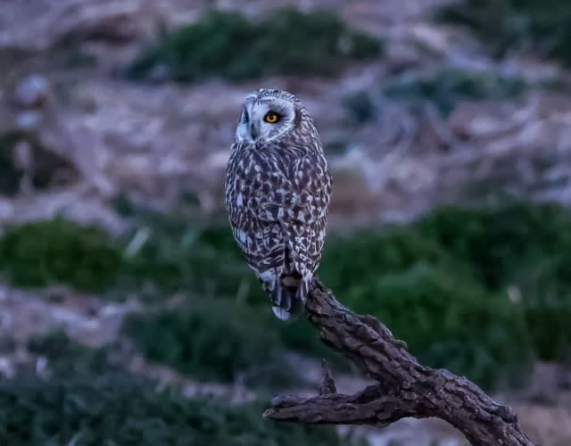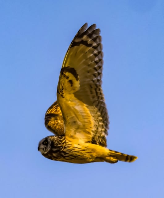 川の土手を飛ぶ夕焼けのコミミズク