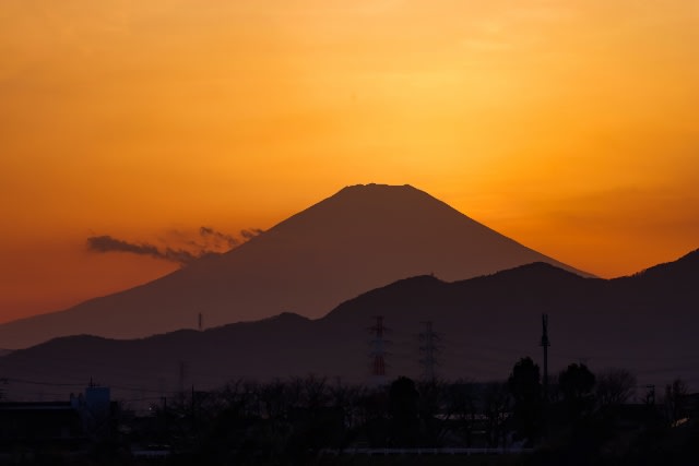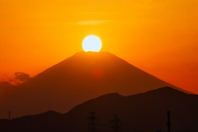 朝焼けのほんのりと紅を差した大鳥居と富士山から